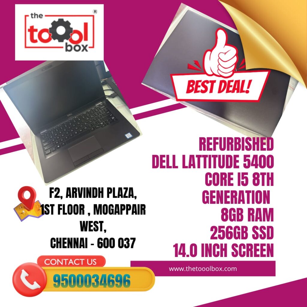 Grab the highly sought-after Dell Latitude 5400 at THE TOOOL BOX in Mogappair West, Chennai! Perfect for professionals and students needing reliable performance.