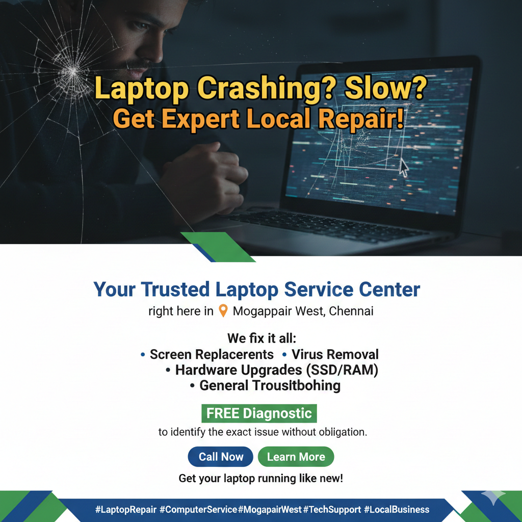 Is your laptop slowing down your work? Don’t buy a new one! We are your trusted Laptop Service Center right here in Mogappair west in chennai, specializing in fast, reliable repairs. We fix it all: Screen Replacements, Virus Removal, hardware upgrades (SSD/RAM), and general troubleshooting. We offer a FREE Diagnostic to identify the exact issue without obligation. Click the ‘Call Now’ button More to schedule your FREE diagnostic today. Get your laptop running like new! #LaptopRepair #ComputerService #Mogappairwest #TechSupport #LocalBusiness