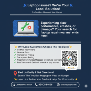 Our The TooolBox branch in Mogappair West is a one-stop solution for all laptop repairs. With years of experience and certified technicians, we ensure your device gets expert care using High-grade tools and spare parts. Certified engineers trained for multi-brand laptop repairs.